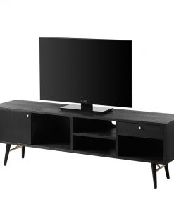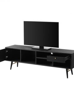 Black oak melamine, powder-coated black metal legs, copper metal accents.